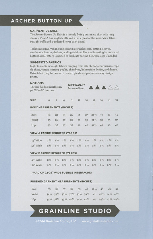 Archer Button Up Shirt Pattern - Grainline Studio - 0 -18