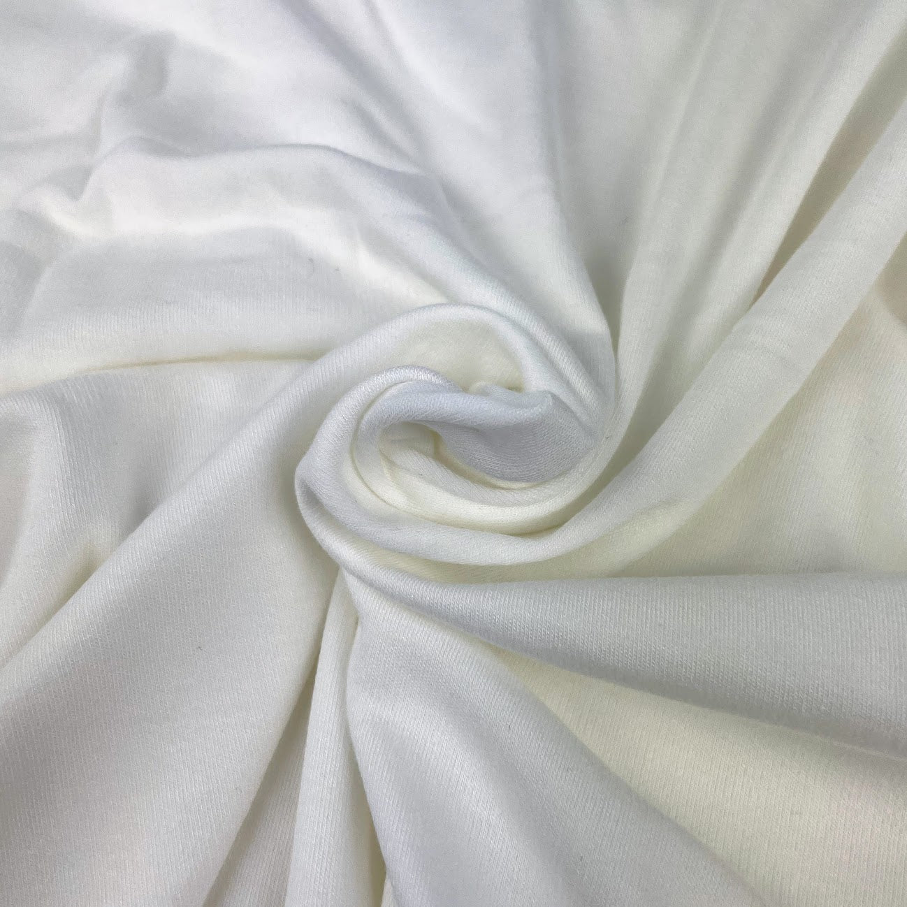 Super soft organic cotton and bamboo interlock. This version has no spandex so it only has moderate mechanical stretch. Interlock is an excellent stable knit that is the recommended fabric for those new to sewing knits and for baby clothes as well. This is a off-white colour without whiteners suitable for dying.