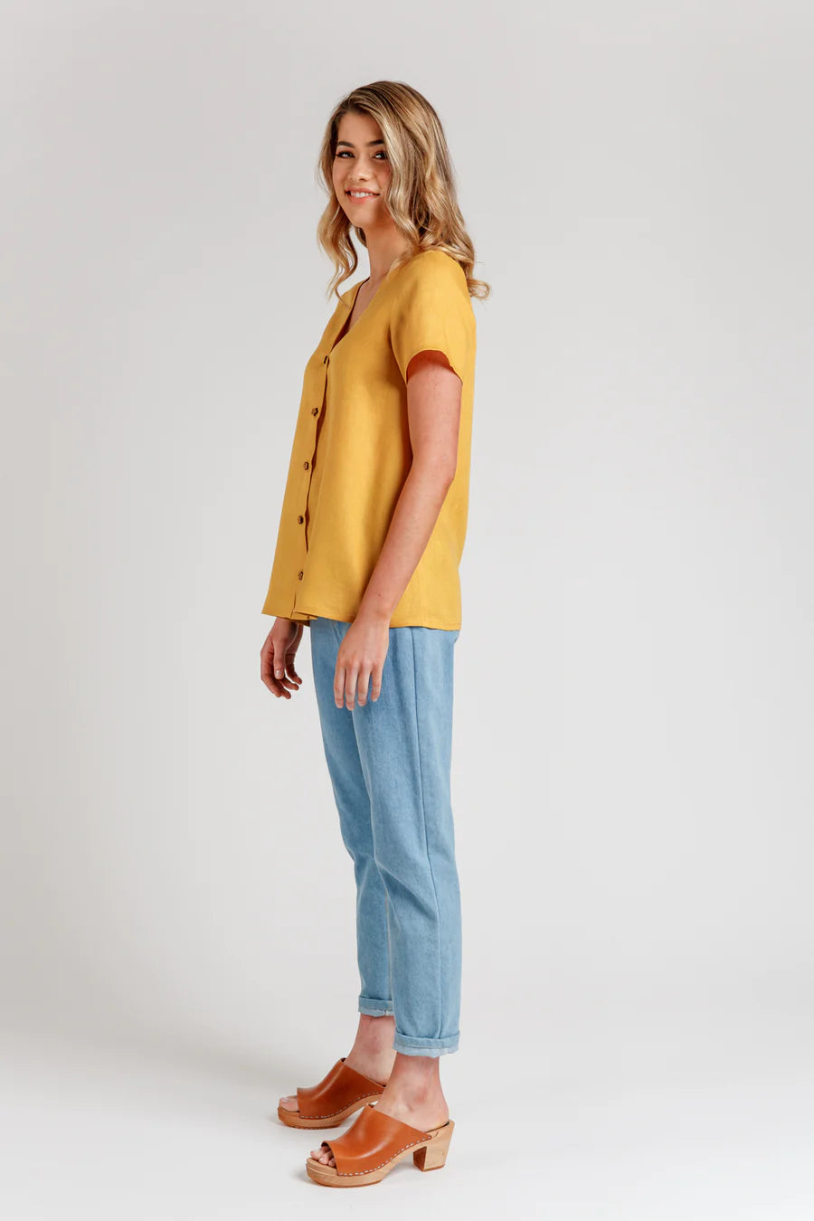 Easily adaptable modern shirt dress. Pattern features deep v-neck, button front, high waistline, multiple sleeve lengths, large pockets and ties at the back to allow it to be worn in a fitted or loose style.