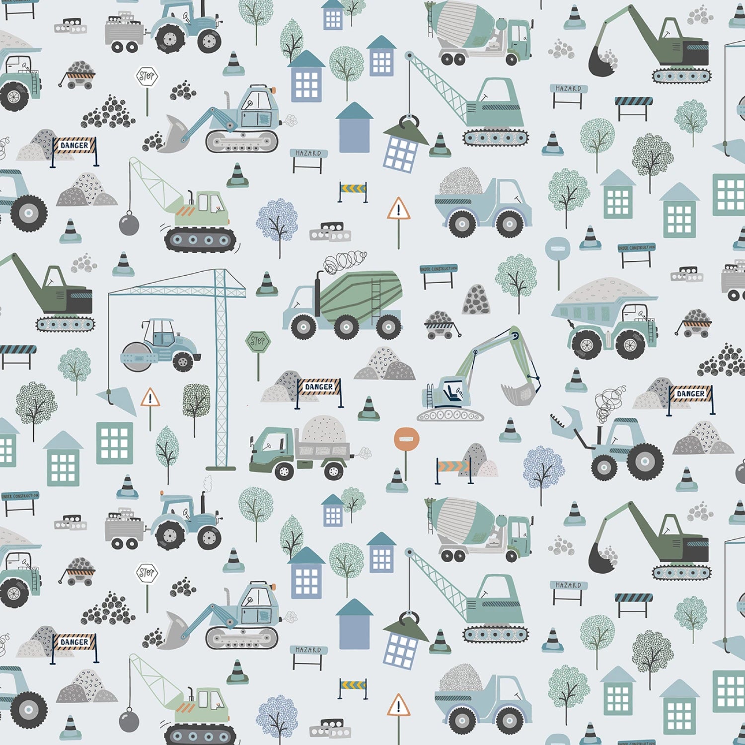 This charming fabric features a delightful construction-themed design, showcasing various types of construction vehicles like excavators, cranes, cement mixers, and dump trucks amidst a backdrop of stylized trees, houses, and construction signs. The playful yet detailed illustration captures the essence of a bustling construction site, making it perfect for children's projects, home decor, or crafting. The light blue background with muted tones of the elements provides a soothing yet engaging visual appeal.