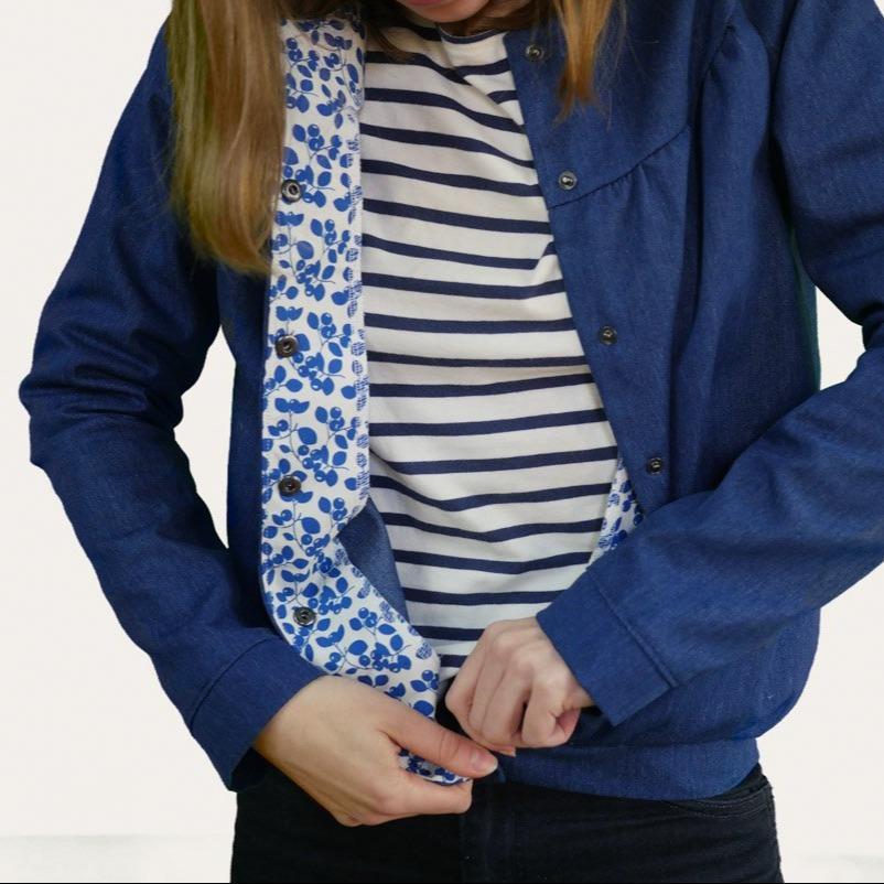 Sewing pattern for women. Cardigan with rounded yoke and gathers. Flared with a simple hem or tucked with a band. Optional front and back ruffle, optional pockets. Complete or partial buttoning. Finishes with a yoke lining.