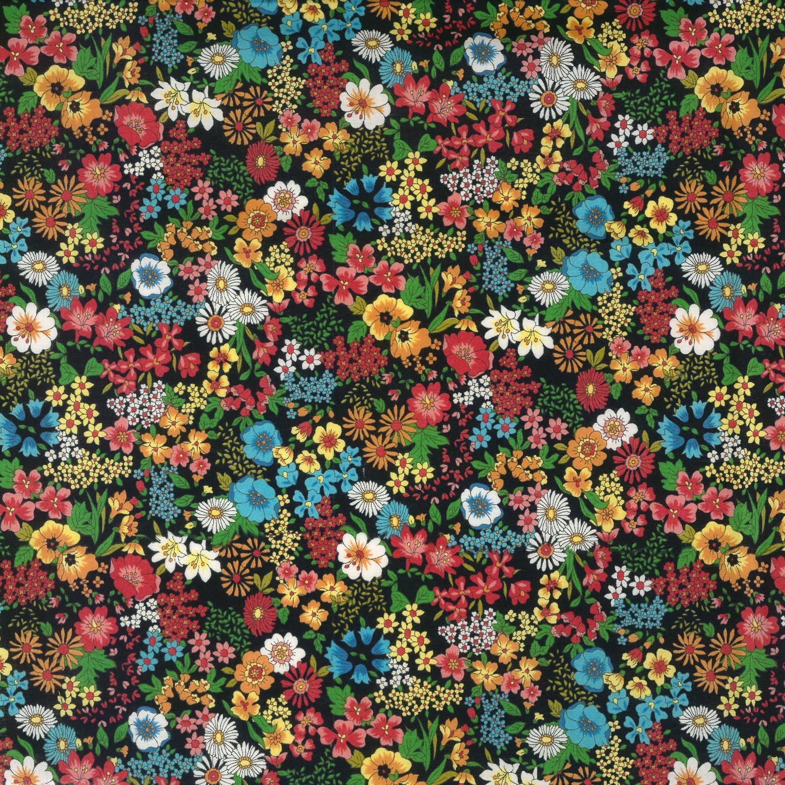This beautiful fabric is from KOKKA's original Flownny series of floral prints. Make something vibrant for summer with this 60's inspired floral fabric on a black background. Very lightweight at 90gsm, this fabric is very breathable and will feel light against the skin. Use it for dresses, blouses, button ups & more.