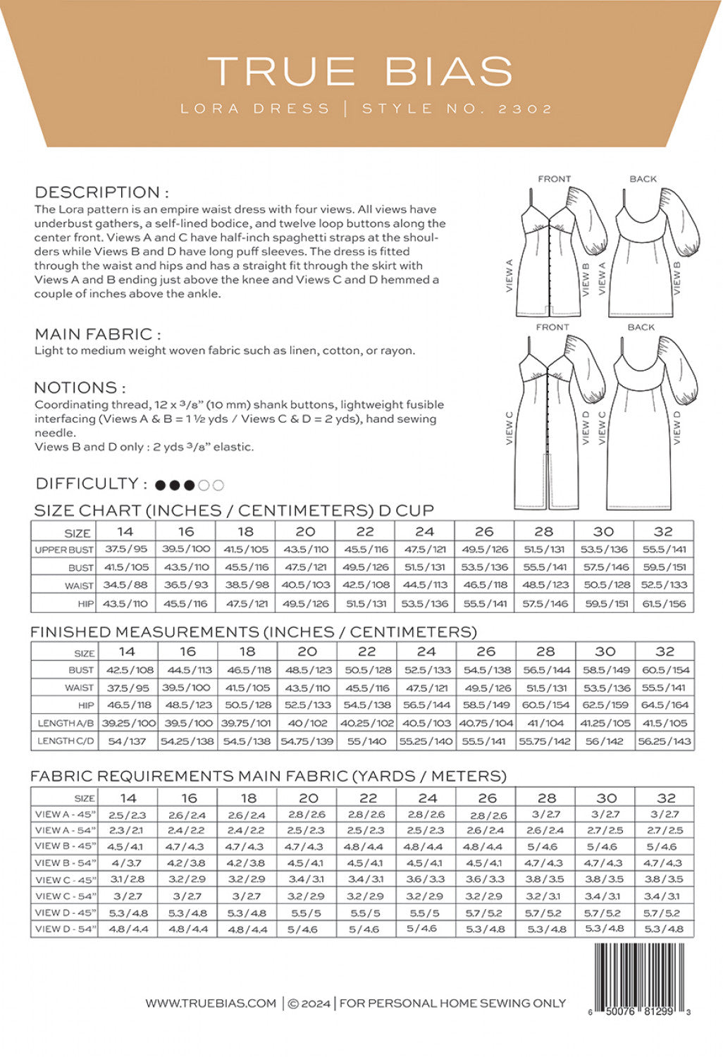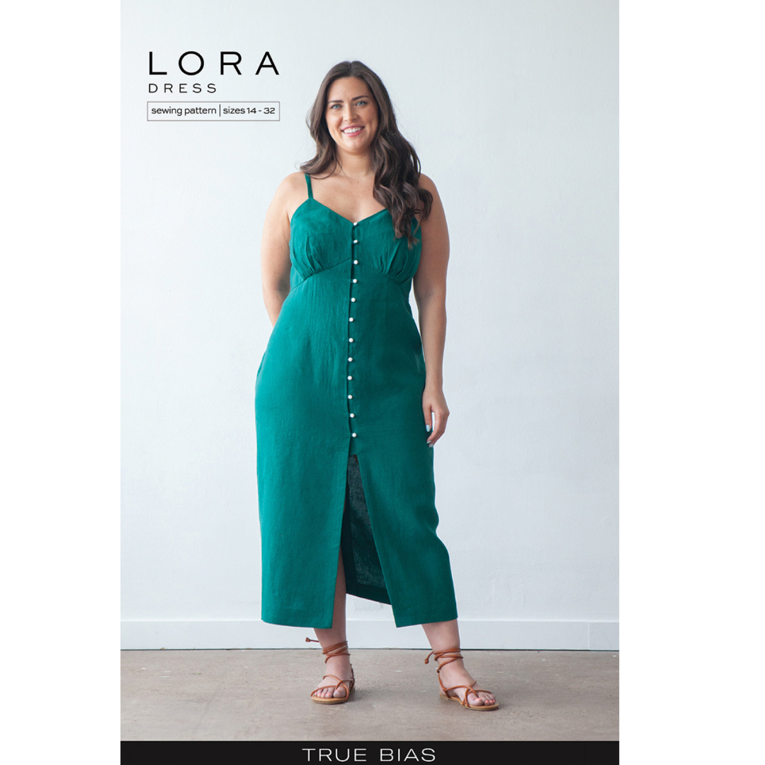 The Lora pattern is an empire waist dress with four views. All views have underbust gathers, a self-lined bodice, and twelve loop buttons along the center front. Views A and C have half-inch spaghetti straps at the shoulders while Views B and D have long puff sleeves.