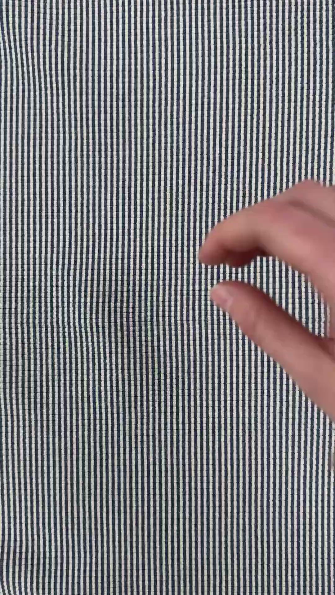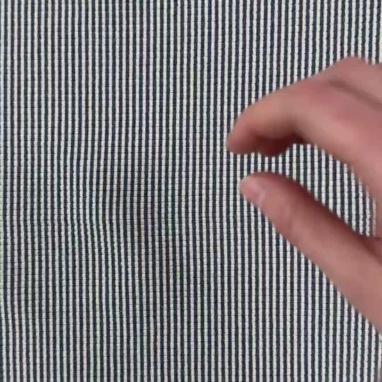 A heavy weight knit seersucker texture fabric. This fabric offers both style and comfort with a classic navy and ivory striped print. The seersucker knit adds texture and dimension to any project. Perfect for long sleeve tee's, dresses, shorts, lounge clothing & more.