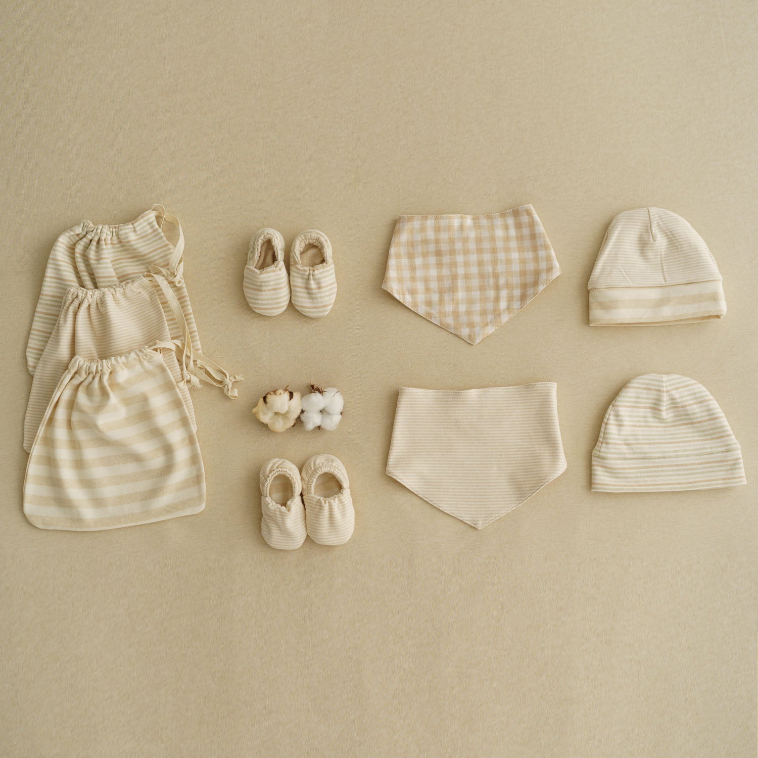 A 100% organic cotton interlock jersey fabric in natural colours like cream, brown and soft green forming minimal stripes. A soft, hypoallergenic and biodegradable fabric that is free of chemicals and ideal for making agreeable and comfortable clothing like bodysuits, t-shirts and rompers.