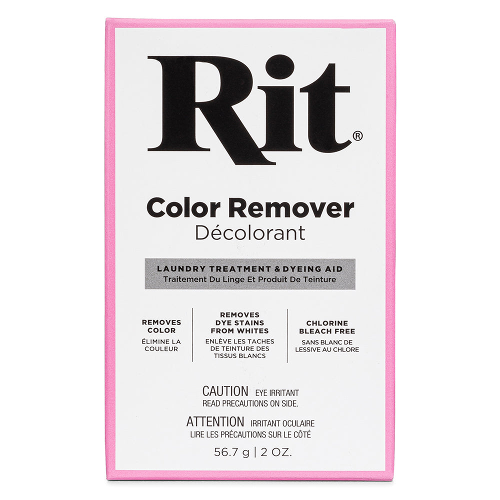 Rit Color Remover is used primarily to remove or reduce colour from fabric prior to dyeing with Rit Dye. It reduces the colour to an off-white or cream colour, creating a clean, even base colour for dyeing.