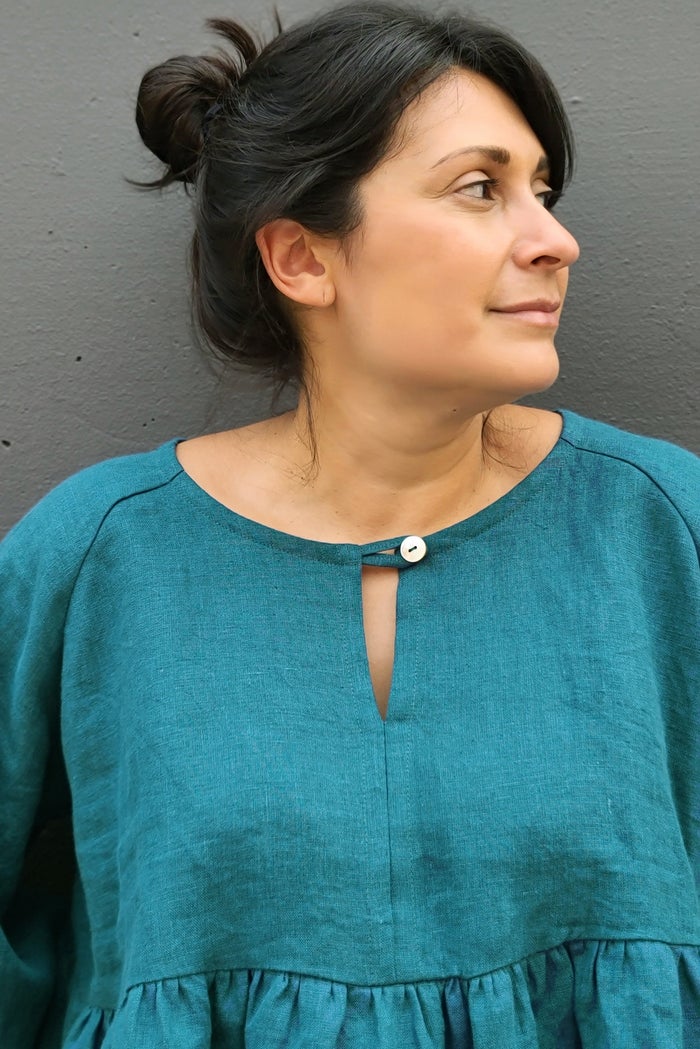 The Romey Gathered Dress & Top pattern is inspired by our beloved Remy Raglan pattern. Beginning with the signature (Version #2) Remy keyhole neckline and loose fit, we shortened the waistline into an elegant empire waist with a gathered skirt or peplum and billowy gathered sleeves at bracelet length. Both dress versions include patch pockets because our customers love pockets. With its flowy and oversized fit, we would classify the Romey Gathered Dress and Top as secret pajamas that can be worn casually with sneakers, sandals or boots. Sew one up in a slinkier fabric for a more polished look!