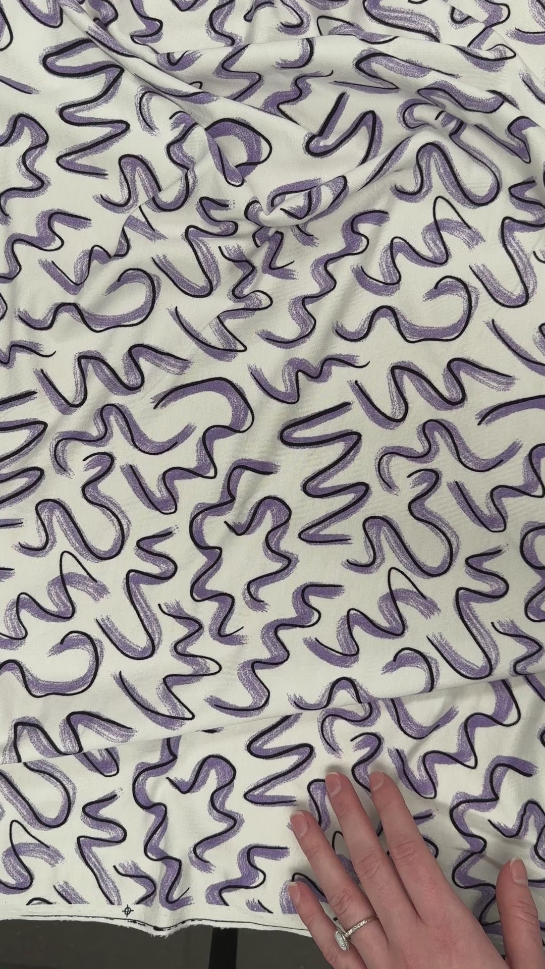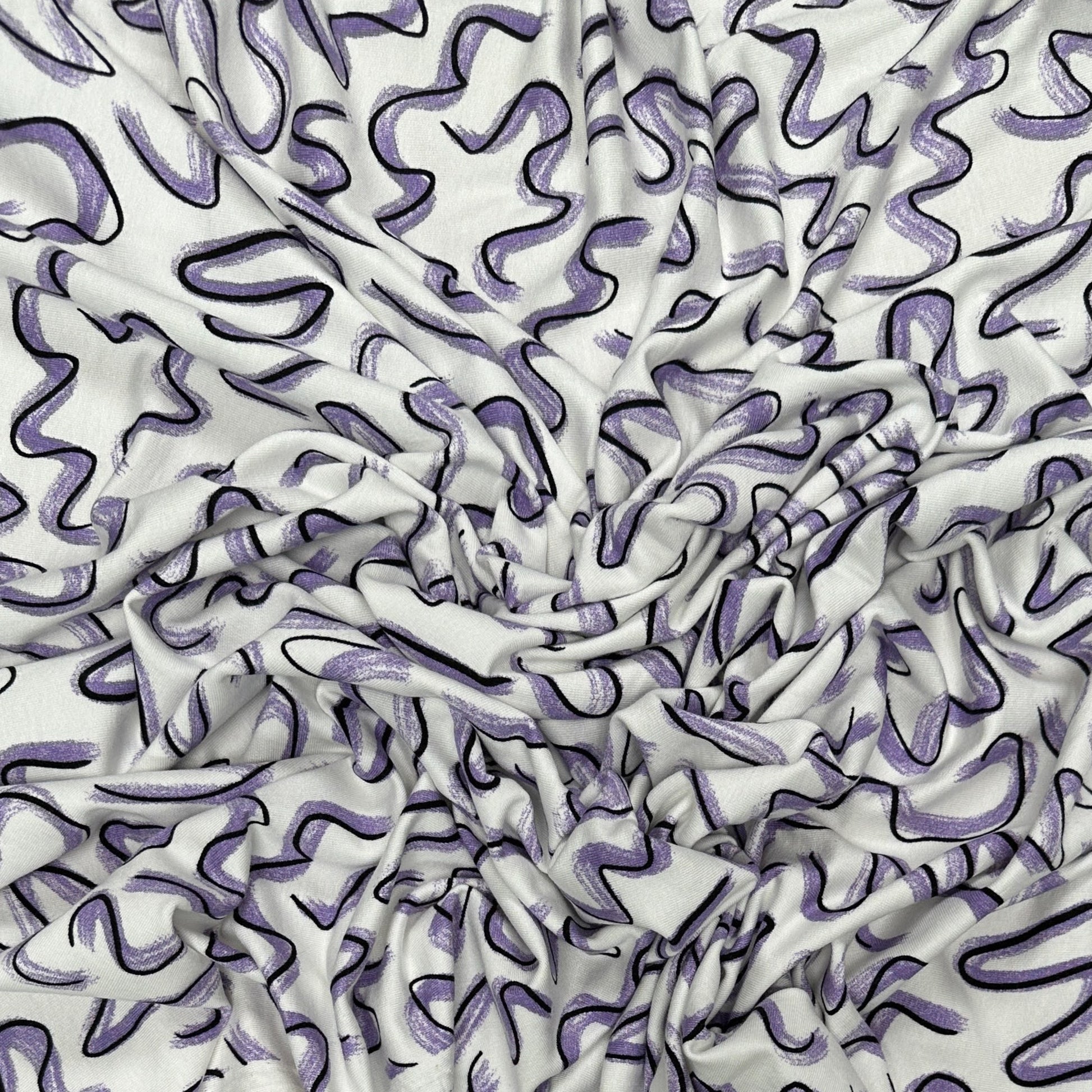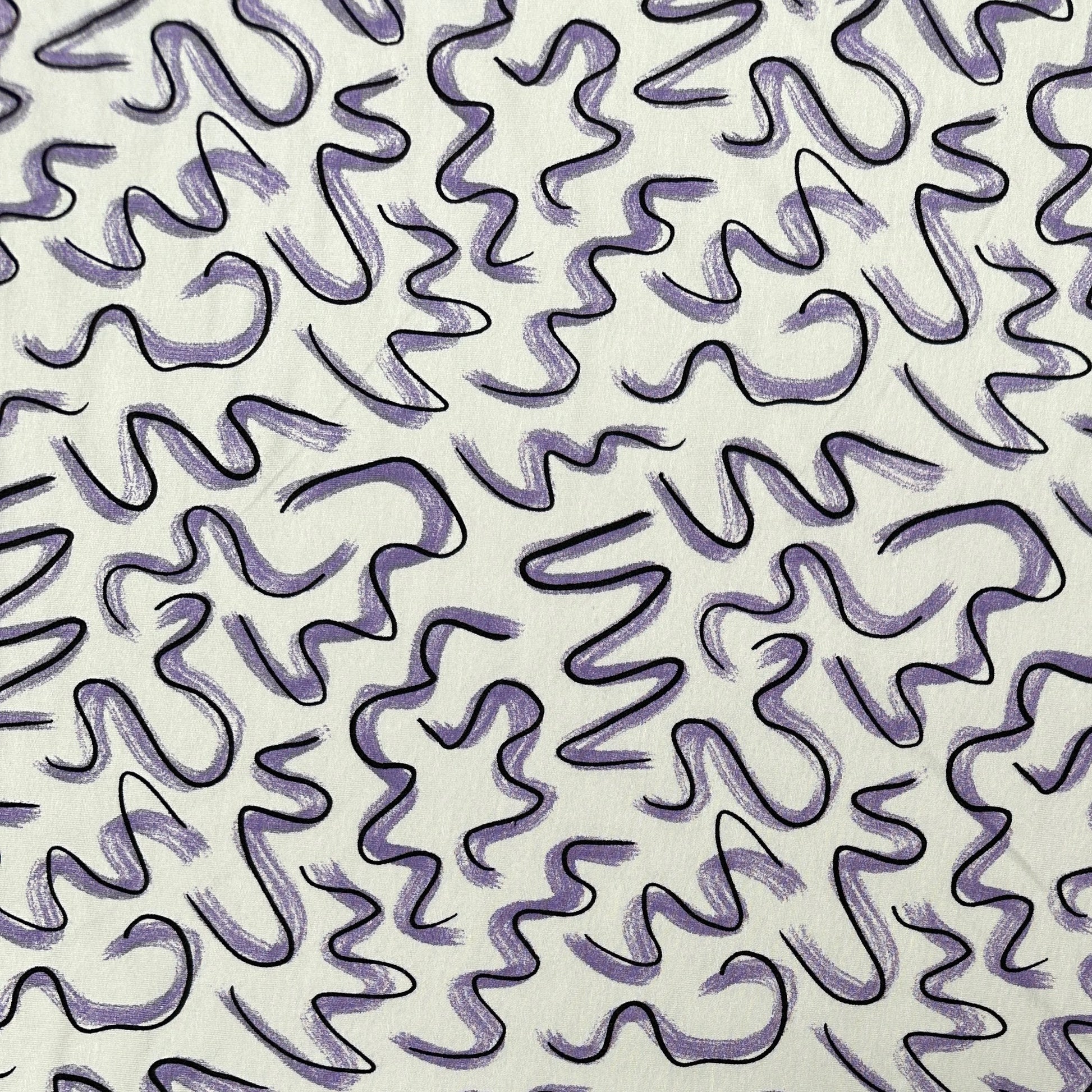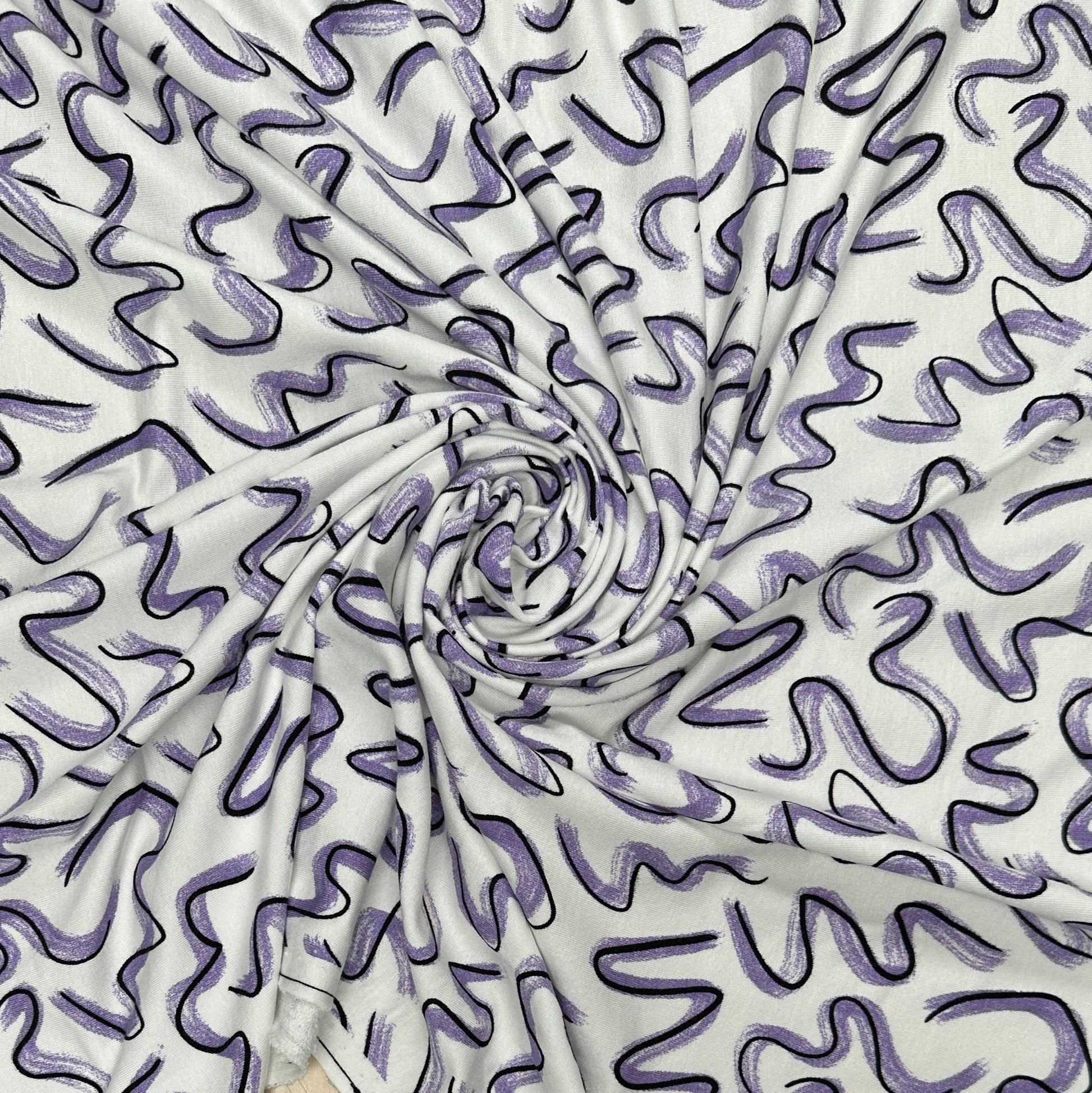 French terry fabric with a fun violet squiggly design. This French terry fabric features an eye-catching violet squiggly design. Made of a blend of Bamboo, cotton, and spandex, this midweight terry knit boasts a playful graffiti abstract print. With a soft handfeel and wrinkle resistant properties, it is perfect for leisure wear, kidswear, bottoms, and tops. Additionally, this fabric is Oeko-Tex certified.