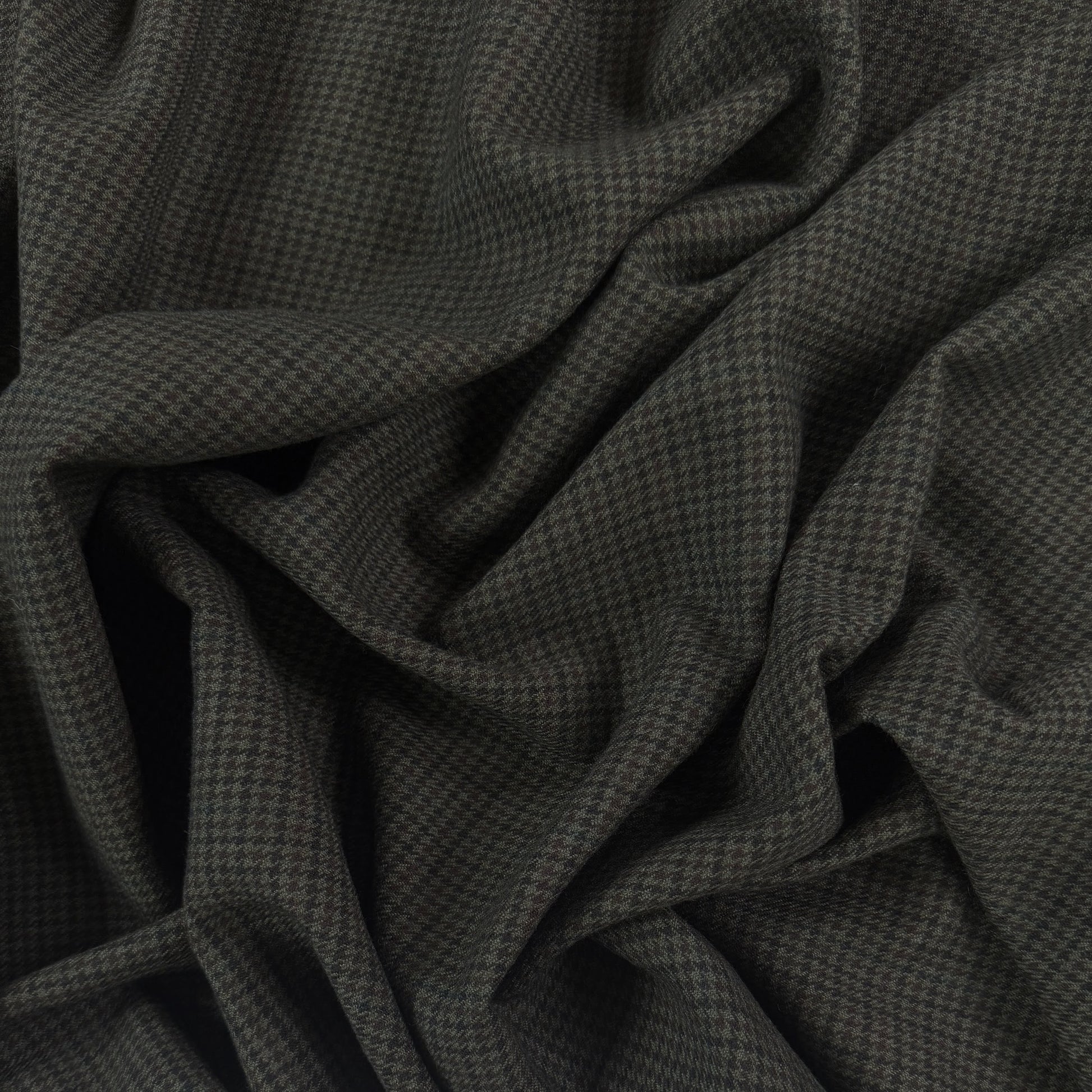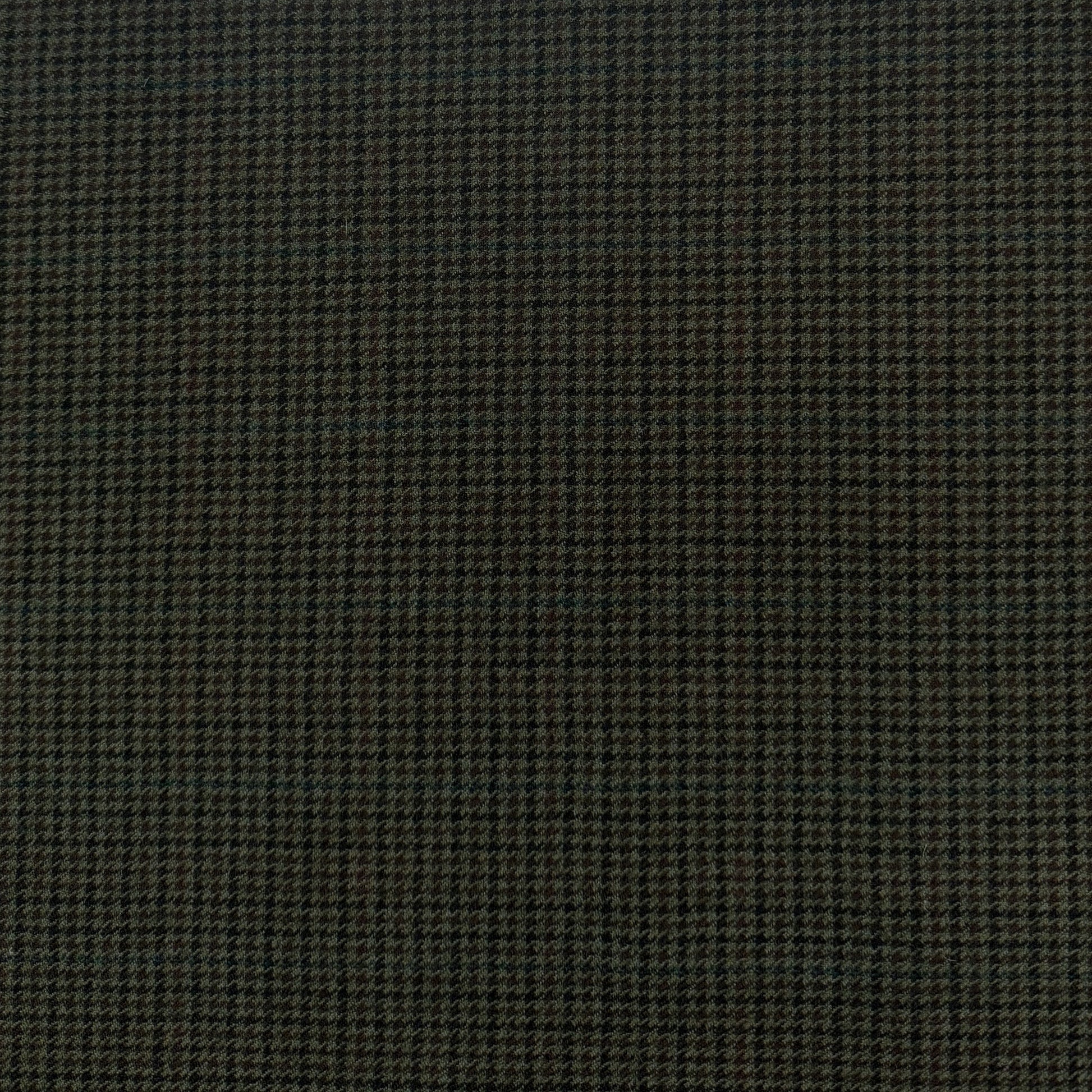 Create something timeless and classic with this black and muted dark green houndstooth fabric. Cozy and warm, use this fabric for fall and transitional garments such as trousers, jackets, heavier skirts & more.