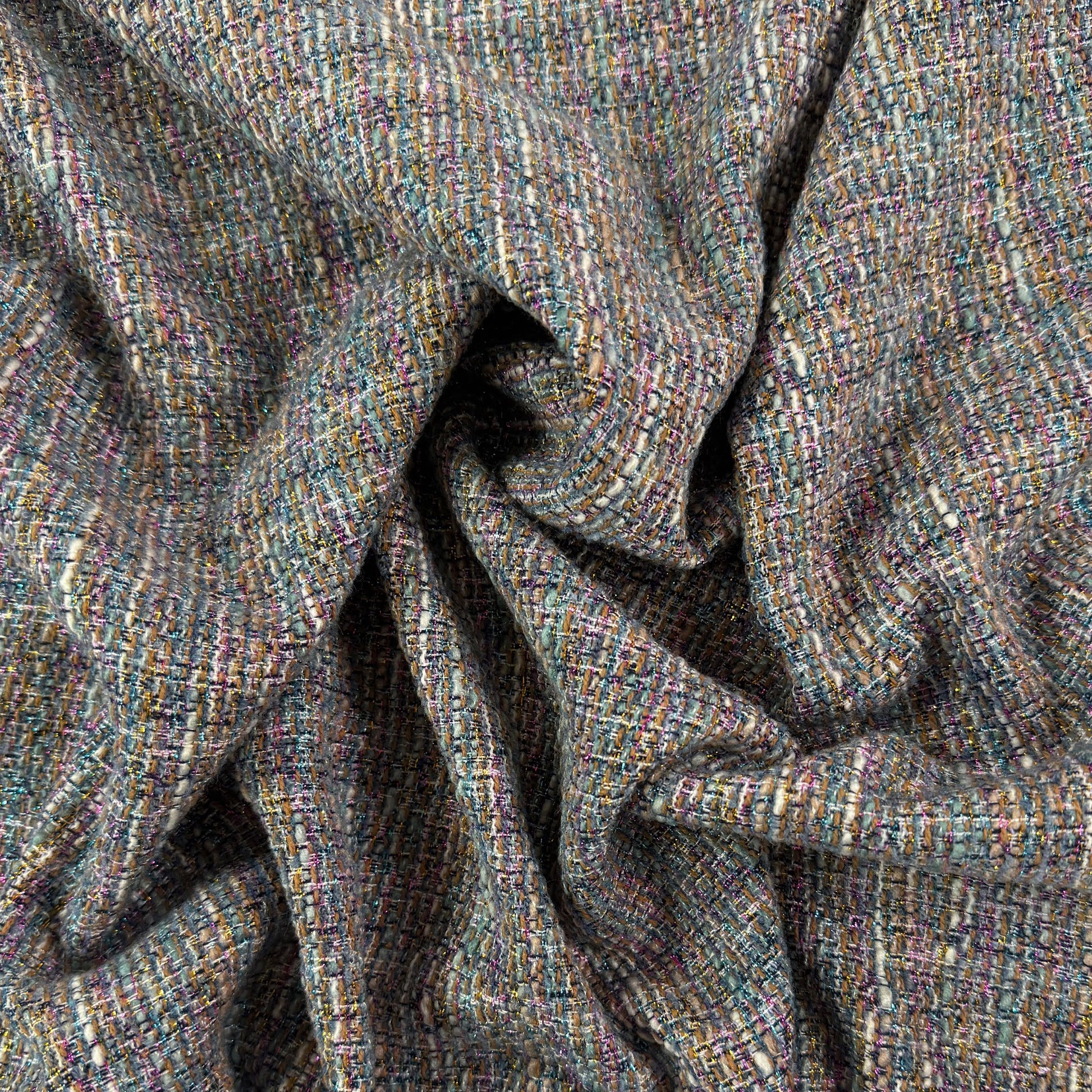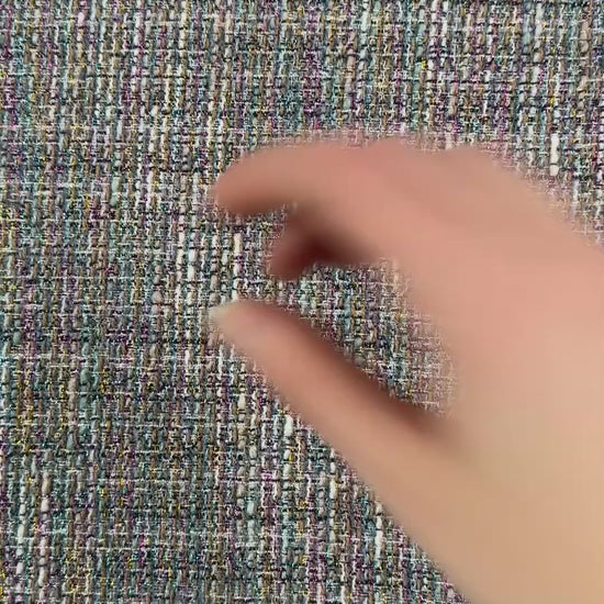 The perfect fabric for adding whimsy and creatively to your wardrobe. This tweed has strands of metallic yarn woven throughout the fabric, creating a gorgeous rainbow effect . Use it for jackets, coats, winter skirts & more.